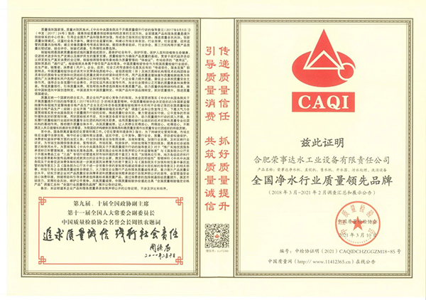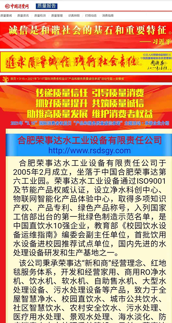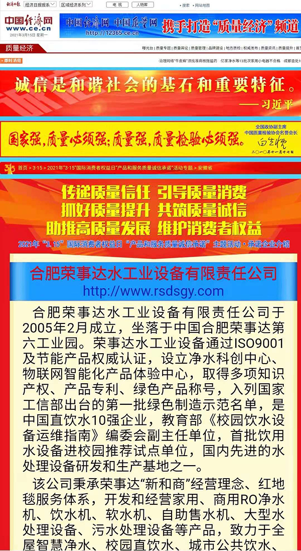 共筑質(zhì)量誠信,引導(dǎo)質(zhì)量消費。在由中國質(zhì)量檢驗協(xié)會主辦的2021年“3.15”產(chǎn)品和服務(wù)質(zhì)量誠信承諾的主題活動中,榮事達憑借卓越的產(chǎn)品品質(zhì)及良好的社會形象,獲得協(xié)會以及權(quán)威專家的一致認可,榮膺 “全國產(chǎn)品和服務(wù)質(zhì)量誠信示范企業(yè)”“全國質(zhì)量信得過產(chǎn)品”“全國凈水行業(yè)質(zhì)量領(lǐng)先品牌” “全國質(zhì)量誠信先進企業(yè)”多項榮譽,《中國質(zhì)量報》、《中國消費者報》及中國質(zhì)量網(wǎng)、中國經(jīng)濟網(wǎng)、中國消費網(wǎng)等多家媒體均予以集中展示和公告。