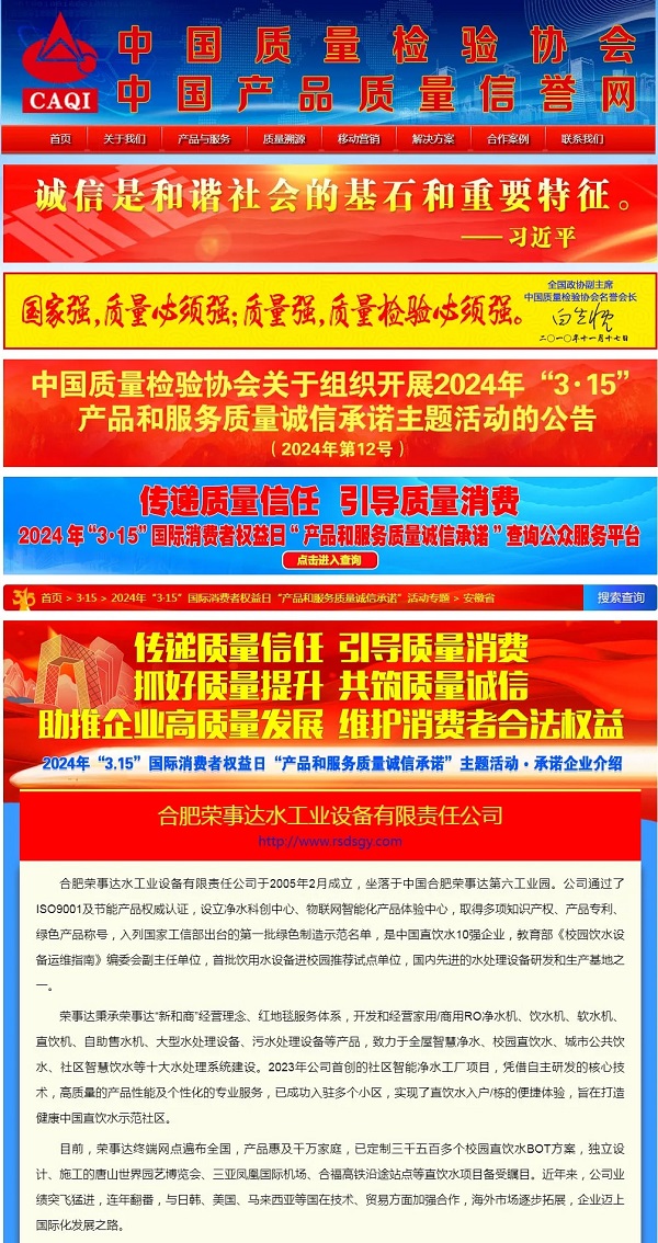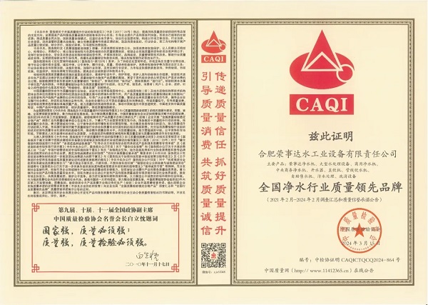 傳遞質(zhì)量信任,引導(dǎo)質(zhì)量消費(fèi)。 在由中國(guó)質(zhì)量檢驗(yàn)協(xié)會(huì)主辦的2024年“3·15”產(chǎn)品和服務(wù)質(zhì)量誠(chéng)信承諾的主題活動(dòng)中,榮事達(dá)水工業(yè)公司憑借卓越的產(chǎn)品品質(zhì)及良好的社會(huì)形象,獲得協(xié)會(huì)以及權(quán)威專家的一致認(rèn)可,榮膺 “全國(guó)產(chǎn)品和服務(wù)質(zhì)量誠(chéng)信示范企業(yè) ”“全國(guó)凈水行業(yè)質(zhì)量領(lǐng)先企業(yè)”“全國(guó)凈水行業(yè)質(zhì)量領(lǐng)先品牌”“全國(guó)產(chǎn)品和服務(wù)質(zhì)量誠(chéng)信品牌”“全國(guó)質(zhì)量檢驗(yàn)穩(wěn)定合格產(chǎn)品”“全國(guó)質(zhì)量檢驗(yàn)信譽(yù)保障產(chǎn)品”“全國(guó)消費(fèi)者質(zhì)量信譽(yù)保障產(chǎn)品 ”多項(xiàng)榮譽(yù)。