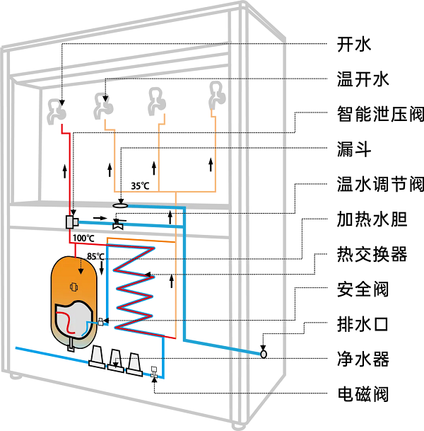 設(shè)備采用節(jié)能熱交換技術(shù),熱損低,更節(jié)能;保溫結(jié)構(gòu)設(shè)計,保溫效果好。多水龍頭布局,有效應(yīng)對飲水量大與飲水集中的問題,確保供水順暢。特別設(shè)計的溫開水出水口,貼心呵護小學(xué)生的飲水需求,安全又溫馨。