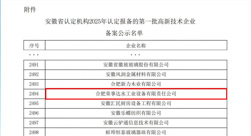 • 合肥榮事達水工業設備有限責任公司通過高新技術企業認定,榮獲由安徽省工業和信息化廳、安徽省財政廳、國家稅務總局安徽省稅務局聯合頒發的《高新技術企業證書》,這一認可,標志著公司在技術創新、成果轉化及核心競爭力建設方面邁上新臺階。