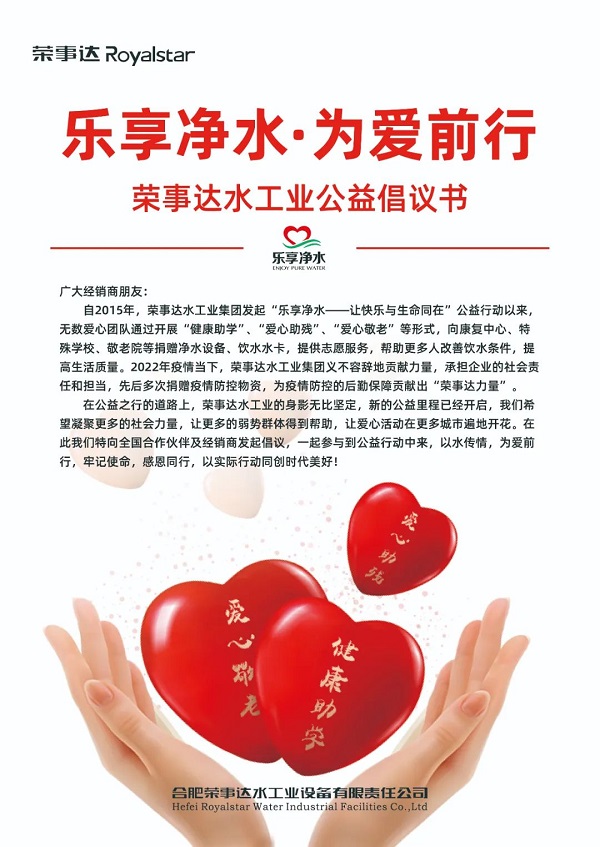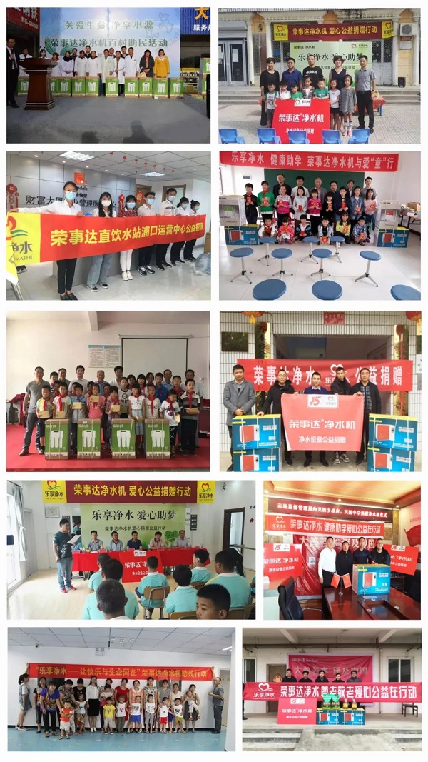 03 榮事達水工業經銷商積極響應集團公益倡議,熱衷于健康助學、愛心敬老、愛心助殘、疫情防控等多種形式的公益行動,截止到目前,經銷商們的公益活動已遍及安徽、南京、湖南、江蘇、陜西、江西、河南、河北等多個地區,以健康好水,溫暖每一個城市。